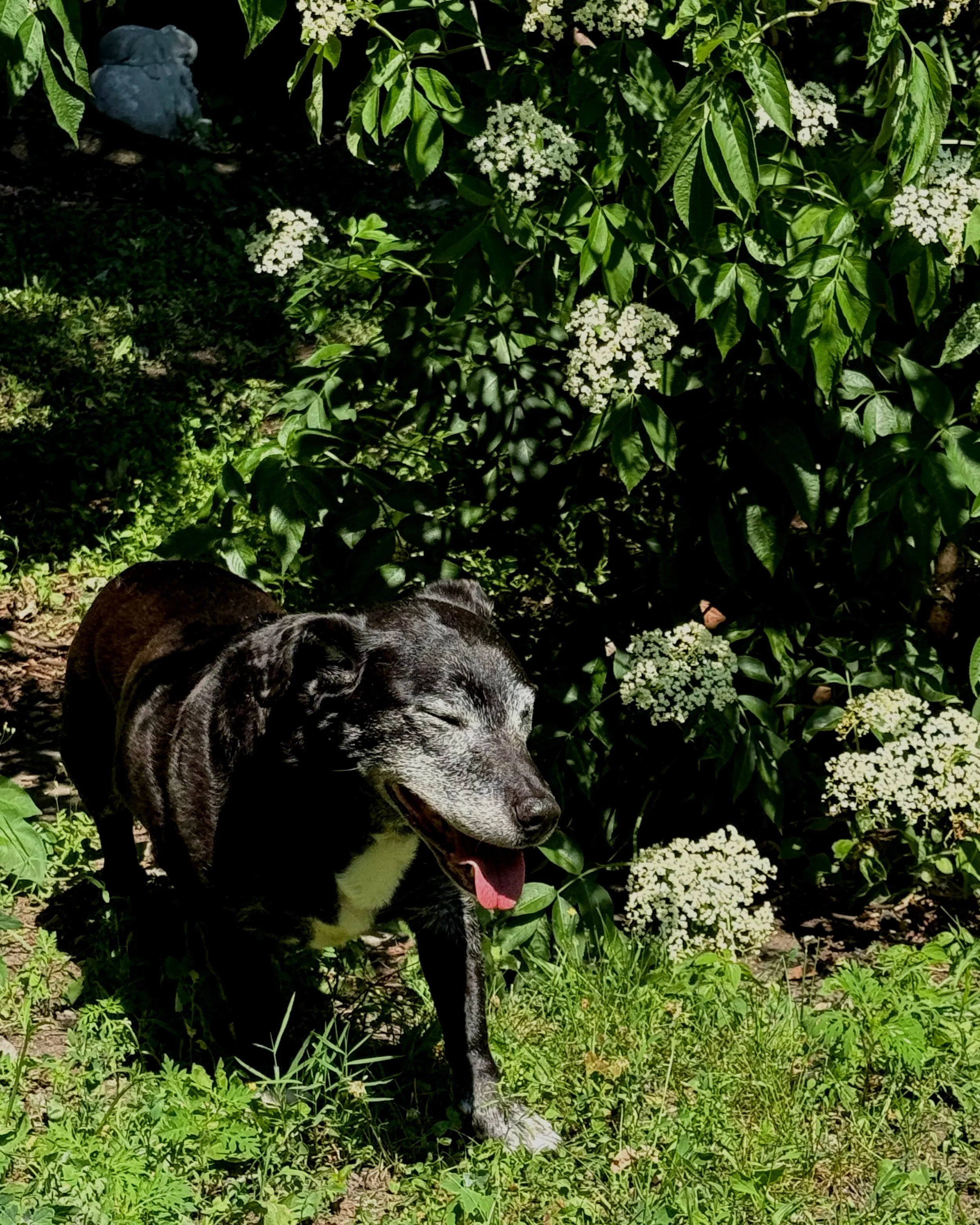Below is a picture of my oldie, Sam, and the Eldertree that is in full bloom in my backyard.